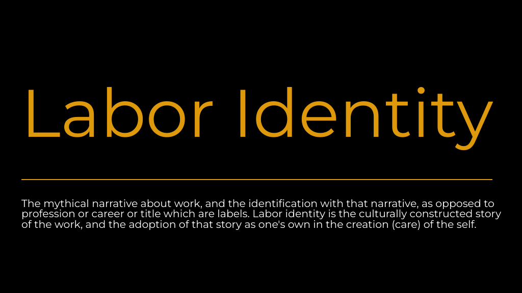 Happiness at work is a bit irrational unless you find purpose in what you do. You are unhappy at work because you have not found “your passion.” Work is not hopeless if an intrinsic and/or social meaning is connected to your labor identity. Then you are not laboring for some unseen bottom-line, for the benefit of others, you are doing work that serves a greater purpose. However, the exploration here is not intended to define happiness or labor identity as right or wrong. Labor identity seems necessary, and we essentialize work, and the discourses of our labor identity become ideology which silences the narratives running contrary. And in this moment in time, post Covid with emerging technology such as Artificial Intelligence, cracks in ideology are more prevalent. This is a project recognizing the network of narratives that influence our labor identity, which is our cultural cosmology. The threads of narrative that are woven together to create our labor identity and the influence of those stories. While I’m exploring primarily professional and skill trades because I’m speaking from my research, as well as my own experience because I’m living and perpetuating/reinforcing the mythology in my work. My methodology (autoethnography) requires a voice from within, but regardless of my limited experience, all types of work are part of this mythology of labor identity.